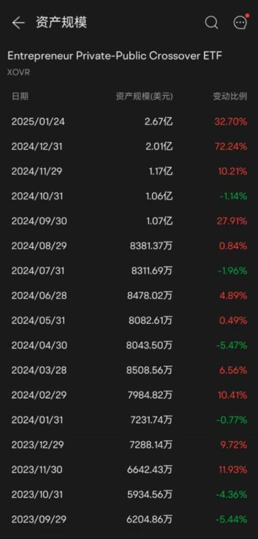 近期,一只名为Entrepreneur Private-Public Crossover ETF(简称XOVR)的ETF产品在美国散户中掀起了一股购买热潮。由于该ETF布局了SpaceX,其资产规模在短短不到两个月的时间内实现了超过128%的惊人增长。截至2025年1月25日,该ETF的资产规模已从2024年11月末的1.17亿美元跃升至2.67亿美元。