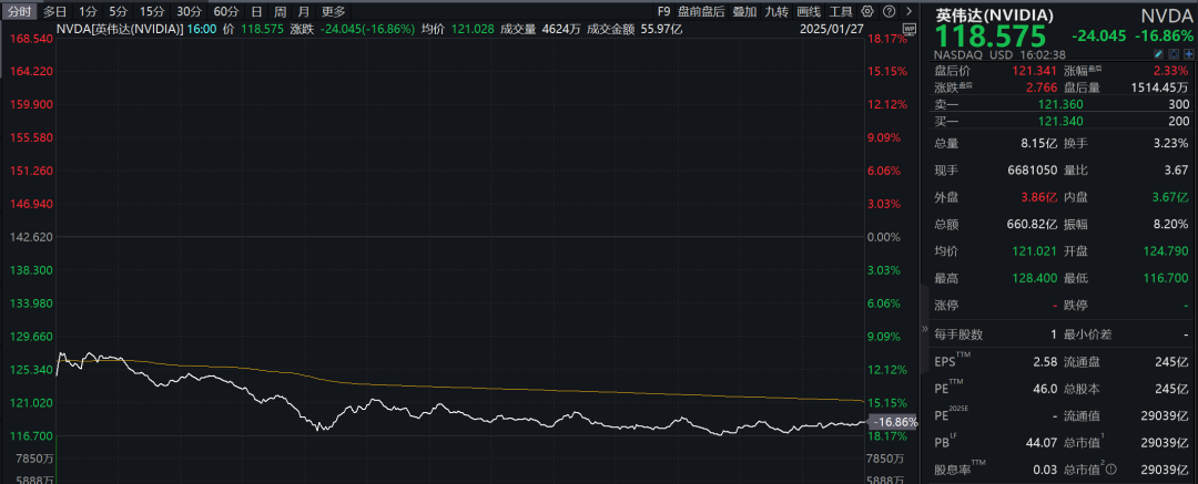 当地时间1月27日,美股科技板块遭遇集体抛售,多只科技龙头股纷纷下挫。其中,纳指收跌3.07%,标普500指数也下跌1.46%。在这场科技股的暴跌潮中,英伟达无疑是最为引人注目的焦点。其股价单日暴跌近17%,市值损失之大,堪称美股历史上的一个里程碑事件。