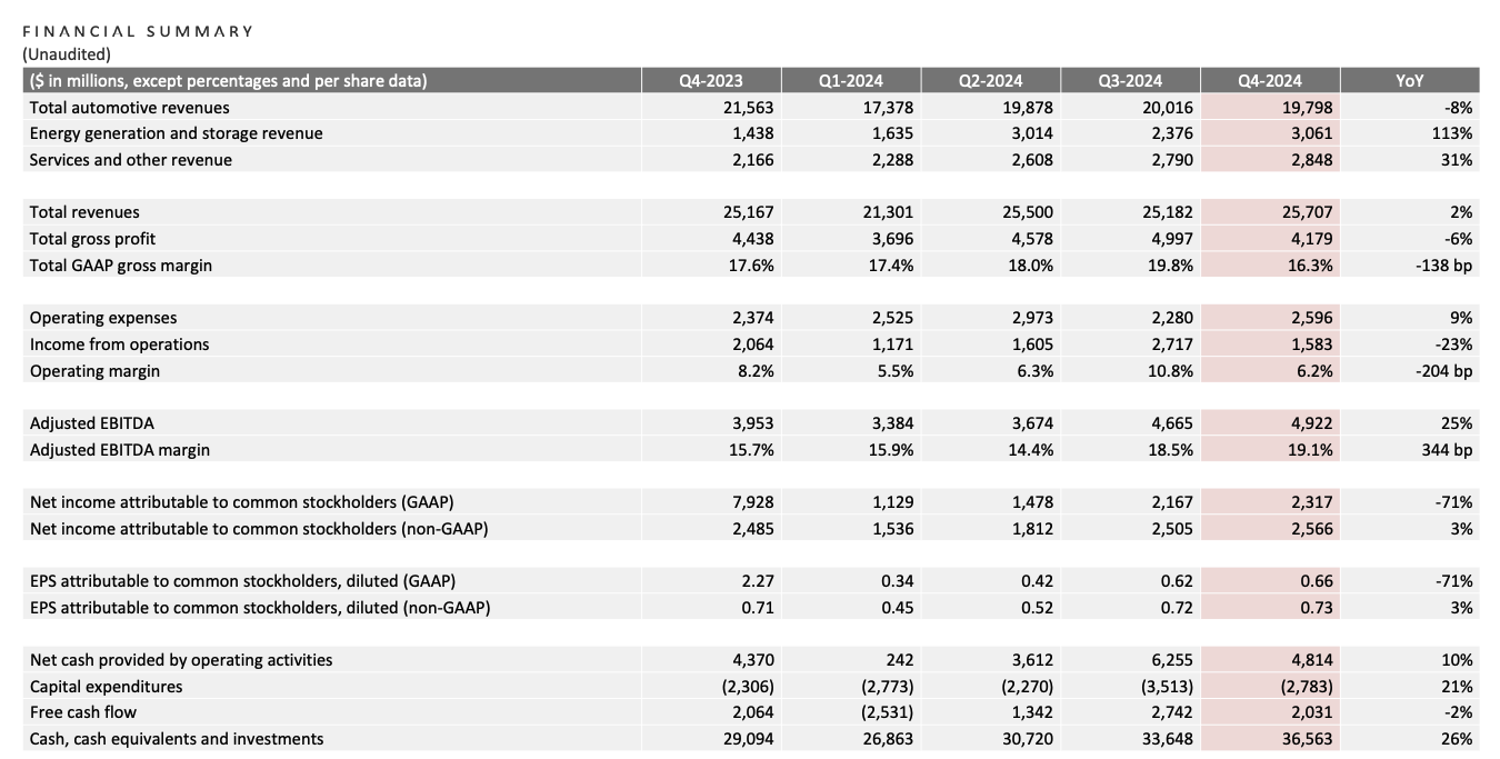 特斯拉发布的2024年第四季度财报显示,经调整后每股收益为0.73美元,略低于市场预期的0.76美元;营收达到257.1亿美元,同样略低于市场预期的272.6亿美元。其中,汽车业务收入同比下降8%至198亿美元,导致公司整体营收仅增长2%。净利润大幅下滑71%至23.2亿美元,营运利润率也显著下降至6.2%。然而,特斯拉的能源业务表现出色,同比增长高达113%,达到30.6亿美元。