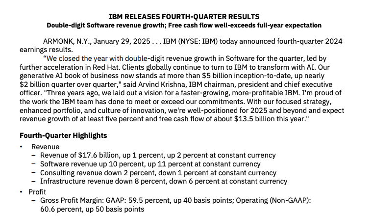 IBM表示,其软件部门四季度收入同比增长10%,达到79亿美元,部分原因是对人工智能技术的需求增加以及其Red Hat Linux操作系统的强劲表现。CEO克里希纳透露,公司在其生成性人工智能业务中已录得50亿美元的订单。
