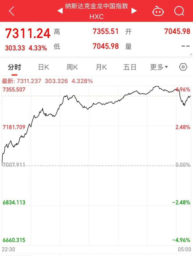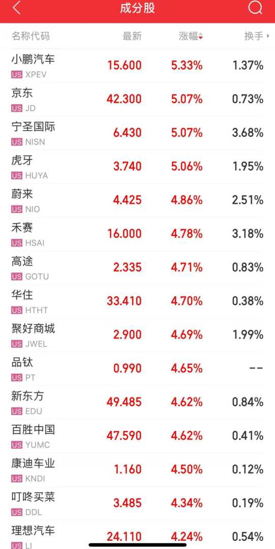 中国资产表现抢眼,热门中概股普遍上涨,纳斯达克中国金龙指数飙升4.33%。其中,金山云涨幅超过13%,爱奇艺上涨超7%,阿里巴巴涨幅逾6%,百度、贝壳、腾讯音乐、蔚来、小鹏汽车等涨幅均超过5%。此外,哔哩哔哩、新东方、理想汽车等也均有不俗表现。