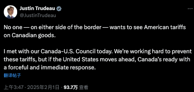 白宫发表最新威胁后,加拿大总理特鲁多表示,没有人希望看到美国对加拿大商品征收关税,但如果美国继续推进,加拿大已准备好采取强有力且立即的回应。