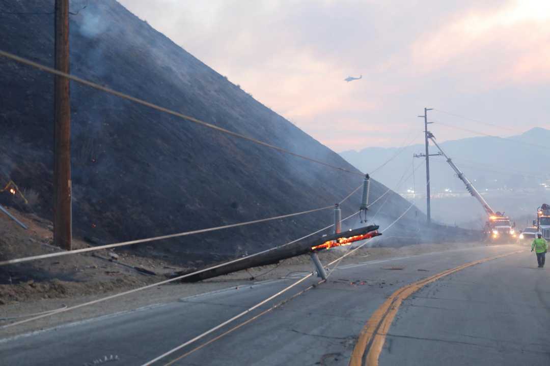 同样在1月22日,洛杉矶县卡斯泰克市的一座山丘上,电线杆因山火肆虐而严重受损,进一步加剧了当地的灾情。图片同样由新华社记者邱晨拍摄。
