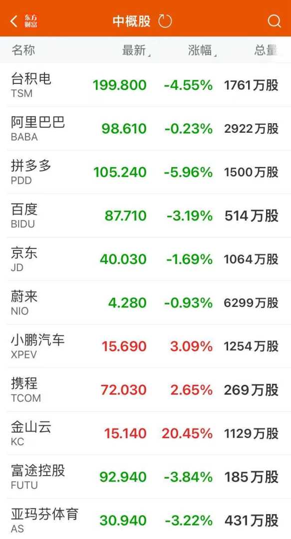科技股方面,多数股票下跌,其中特斯拉股价跌幅超过5%,市值一夜之间蒸发约670亿美元(约合人民币4900亿元);苹果公司股价也下跌超过3%;英伟达股价接近3%的跌幅。与此同时,中概股表现同样不佳,拼多多股价下跌超过5%,而金山云则逆势上涨超过20%,成为市场的亮点。