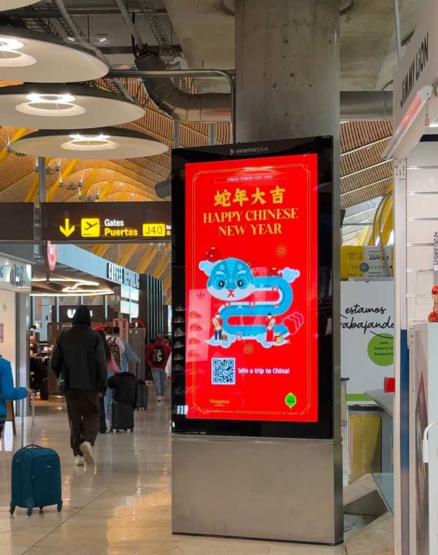 在异国他乡,中国春节的氛围竟然如此浓郁。抵达马德里机场后,迎接我的不仅有家的温暖,还有庆祝中国春节的电子海报。蛇年大吉的祝福语在机场大厅内格外醒目,引得刚刚入境的游客纷纷驻足。