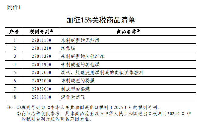 一、对进口自美国的煤炭和液化天然气,将加征15%的关税。具体涉及的商品范围详见附件1。