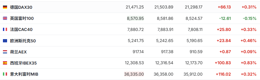 与此同时,欧洲股市在交易时段多数呈现上涨态势,其中德国DAX30指数上涨0.31%,法国CAC40指数上涨0.33%,而英国富时100指数则微跌0.15%。