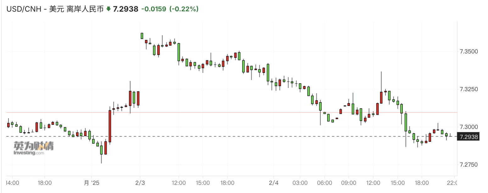 此外,针对加拿大和墨西哥的关税实际上比预期要大,但最新消息显示美国将暂缓30天征收。与此同时,中国宣布对美国部分商品征收10%到15%的关税,并实施出口管制措施。离岸人民币对美元汇率小幅走强。