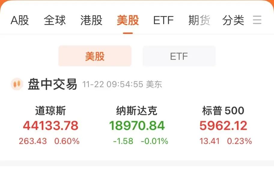当地时间周五,美股市场开盘后表现分化。截至发稿,道琼斯工业平均指数上涨0.6%,纳斯达克综合指数微跌0.01%,标普500指数则上涨0.23%。