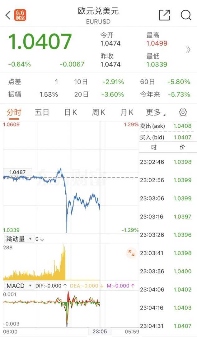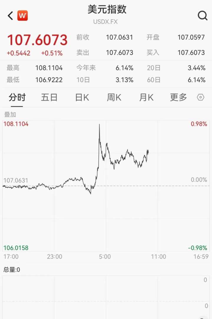 美元指数当日快速拉升,一度突破108关口,日内涨幅接近1%,创下2年来新高,截至发稿时回调至107.6073。