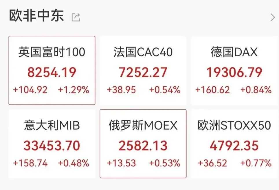 欧股方面,主要指数集体高开。截至发稿,欧洲斯托克50指数、德国DAX指数、英国富时100指数和法国CAC40指数分别上涨0.77%、0.84%、1.29%和0.54%。