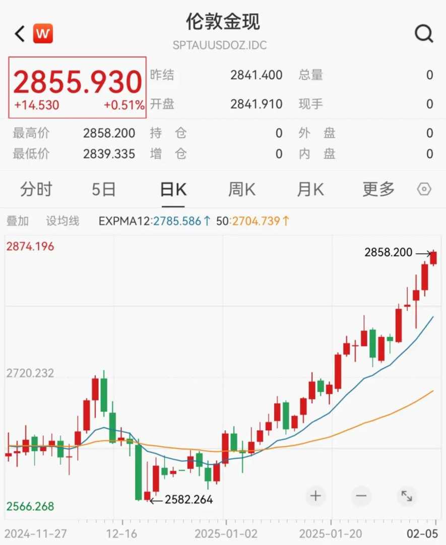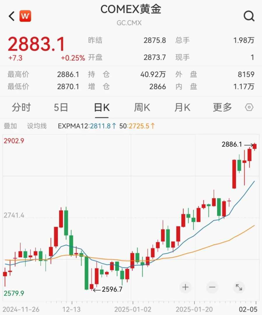 2月5日,国际金价再度刷新历史记录。伦敦金现价格一度攀升至每盎司2858.20美元,COMEX黄金价格也一度突破每盎司2886.1美元的大关。尽管随后国际金价略有回调,但伦敦金现仍维持在2855.93美元/盎司的高位,COMEX黄金也保持在2883.1美元/盎司的水平。