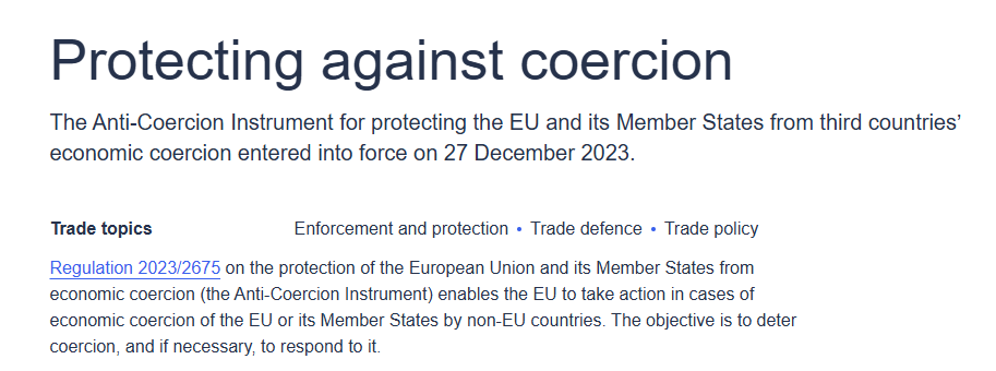 回顾历史,2023年,欧洲理事会正式通过了ACI立法,旨在震慑那些针对欧盟或其成员国采取不利行动的第三国。该立法的初衷是通过对话缓和紧张局势,并促使相关方停止在贸易和投资领域的胁迫行为。