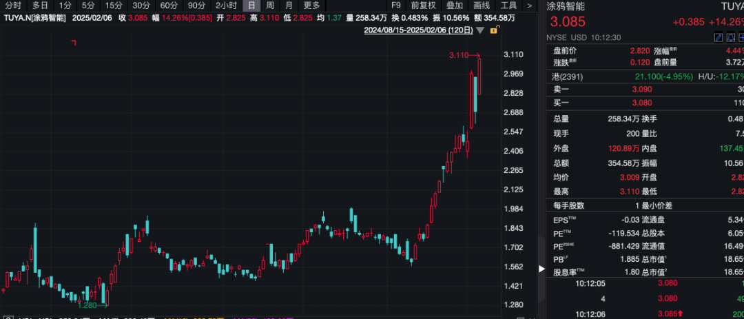 在中概股方面,涂鸦智能的股价大涨超过14%,成为市场关注的焦点。消息面上,涂鸦智能宣布与奇瑞汽车达成合作,共同打造智能驾驶舱,加速汽车与家庭生态系统的融合。这一合作有望为消费者带来更舒适、便捷的出行及家居体验。