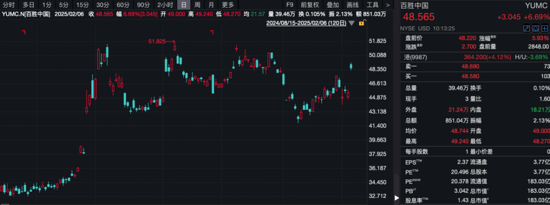此外,百胜中国的股价也在盘中上涨超过7%。2月6日,百胜中国公布了2024年第四季度及全年财报。数据显示,2024年第四季度百胜中国总收入同比增长4%至26亿美元;经营利润同比增长36%至1.51亿美元;经营利润率为5.8%,同比增长140个基点。系统销售额也同比增长4%,主要得益于5%的净新增门店贡献。同店交易量同比增长4%,连续第八个季度实现增长。