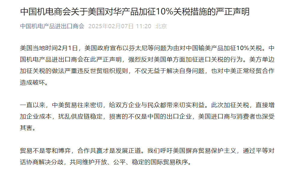 2025年2月7日,中国机电商会通过其官方微信公众号正式发布了一份针对美国对华产品加征10%关税措施的严正声明,引发了业界的广泛关注。