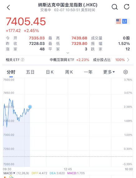 在2月7日晚间的交易中,纳斯达克中国金龙指数表现出色,涨幅超过2%!