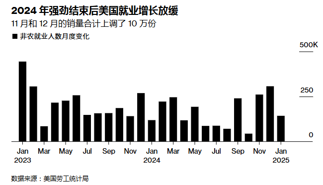 从消息面来看,美国1月的就业增长出现放缓迹象。政府的年度修订数据也显示,去年劳动力市场的活力低于此前预期。美国劳工统计局周五发布的报告显示,1月份非农就业人数增加了14.3万,低于市场预期的17万。同时,政府对2024年12月和11月的就业数据进行了上修,但去年平均每月新增就业人数仍低于最初报告的数值。