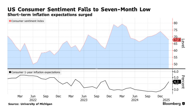 另外,美国消费者信心在2月初也下降至七个月以来的低点。短期通胀预期因对关税的担忧而飙升。根据密歇根大学的数据,2月初消费者信心指数下降了3.3点,至67.8,低于经济学家预期的74。