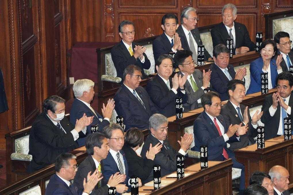 11月11日,日本东京国会众议院会议现场,石破茂在接受祝贺。新华社记者张笑宇摄