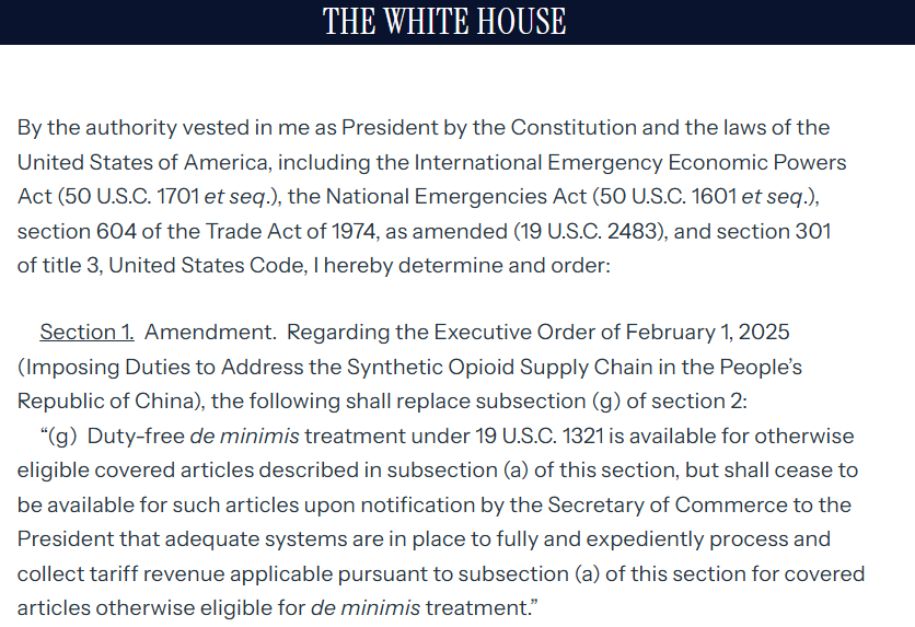 白宫周五发布的新行政令则指出,目前将继续对来自中国的商品实行“最低限度”关税豁免待遇,直至美国商务部建立起足够的系统来全面、迅速地处理和收取关税收入。这一决定为市场带来了一定的缓冲。