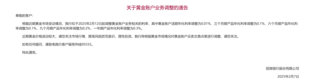 2月7日,招商银行发布公告称,根据近期黄金市场变动情况,将于2月12日起调整黄金账户业务相关的利率。其中,黄金账户活期年化利率调整为0.01%,三个月期产品年化利率调整为0.1%,六个月期产品年化利率调整为0.1%,九个月期产品年化利率调整为0.2%,一年期产品年化利率调整为0.3%。此次调整幅度较大,最高下调达30个基点。