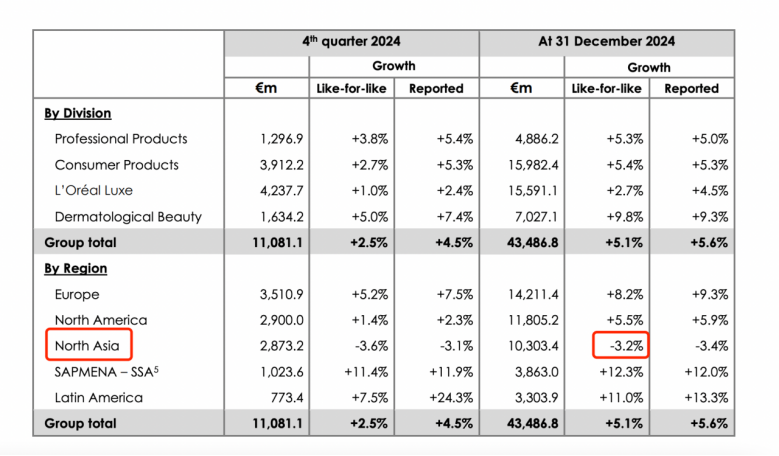 北亚是欧莱雅2024年唯一一个收入下滑的地区财报截图