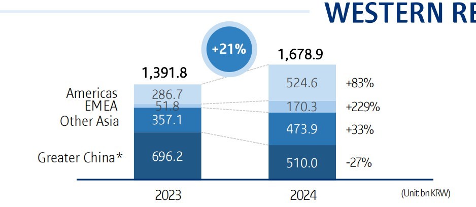 尽管在大中华区表现不佳,但爱茉莉太平洋集团在海外市场却实现了扭亏为盈。这主要得益于美洲和EMEA地区(欧洲、中东和非洲地区)的增长。这两个地区的营收分别同比增长83%和229%,带动了爱茉莉太平洋集团2024年营收的整体增长,结束了连续两年的下滑趋势。