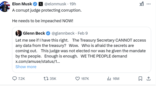 马斯克呼吁弹劾法官,反对限制DOGE访问财政部数据