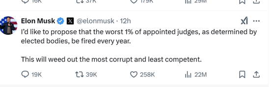 马斯克进一步提出,应每年解雇表现最差的1%的法官,以此淘汰那些腐败无能者。