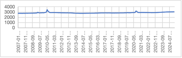 图 2007年1月-2025年1月美国联邦政府雇员数量单位:千人