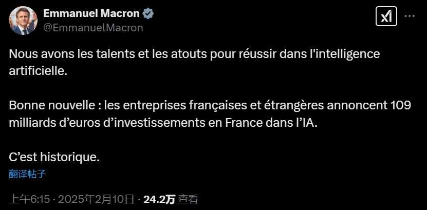 在备受瞩目的巴黎人工智能行动峰会即将召开之际,法国总统马克龙于周一宣布了一项重大决定:未来数年,法国及全球企业将共同向法国AI产业注入高达1090亿欧元的巨额投资。这一消息犹如一颗重磅炸弹,在AI领域掀起了轩然大波。