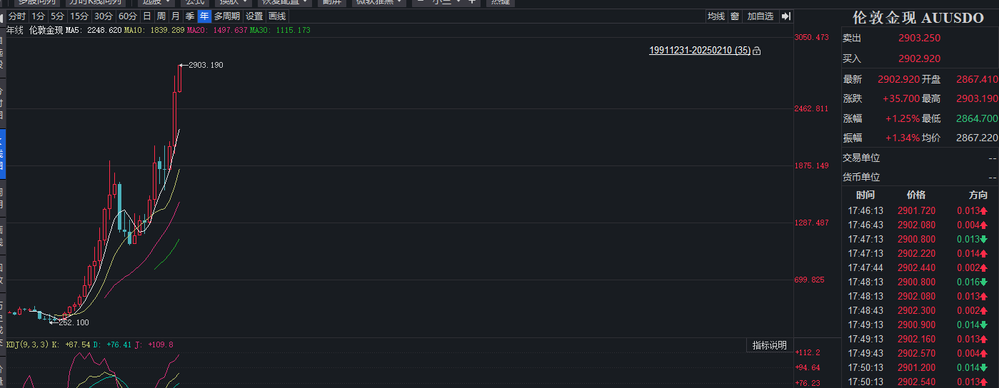 周一,在美国总统特朗普宣布将对钢铁和铝制品征收25%关税后,黄金价格上涨,再刷历史新高,截至北京时间下午六点,盘中最高触及2903.19美元/盎司。