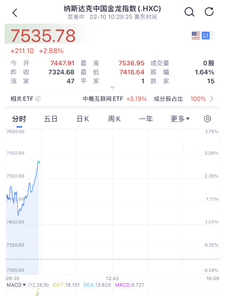 2月10日晚间,美股开盘后,中概股指数的代表——纳斯达克中国金龙指数,大涨近3%!