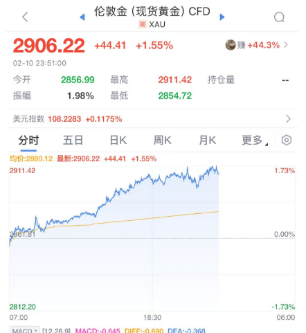 2月10日晚间,美股开盘后,中概股大涨近3%,阿里巴巴、百度等个股涨幅显著。同时,美股三大指数上行,纳指涨超1%。特朗普宣布关税威胁,但市场情绪有所改善。此外,现货黄金持续上涨,突破2900美元/盎司。