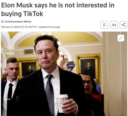 中新网2月10日电 据路透社8日报道,美国企业家马斯克表示,他对收购TikTok不感兴趣。