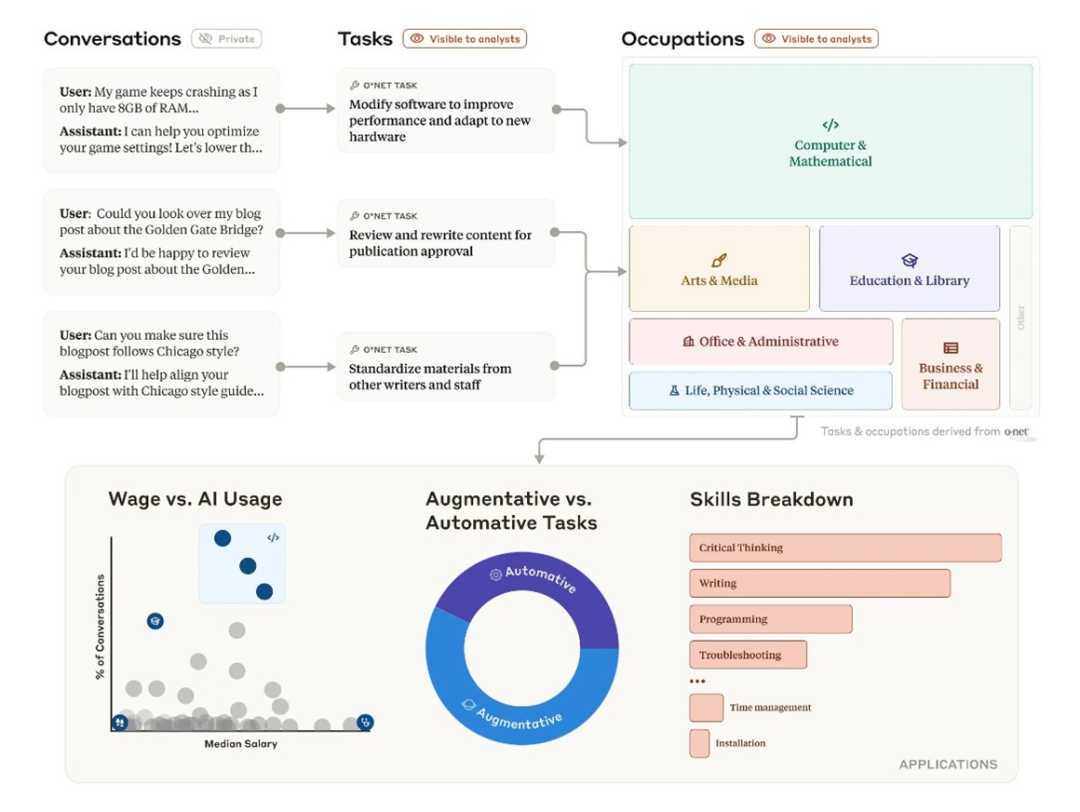 与之前依赖专家预测或分析调查的研究不同,Anthropic的研究是基于数百万次用户实际使用AI的方式的直接分析。Anthropic利用其隐私保护分析工具Clio检查了数百万次用户与Claude的对话,然后根据美国劳工部(DOL)的分类选择任务,将用户与Claude的匿名对话转化为职业任务,并进一步映射到DOL维护的数据库O*NET(职业信息网络)提供的职业/职业类别。