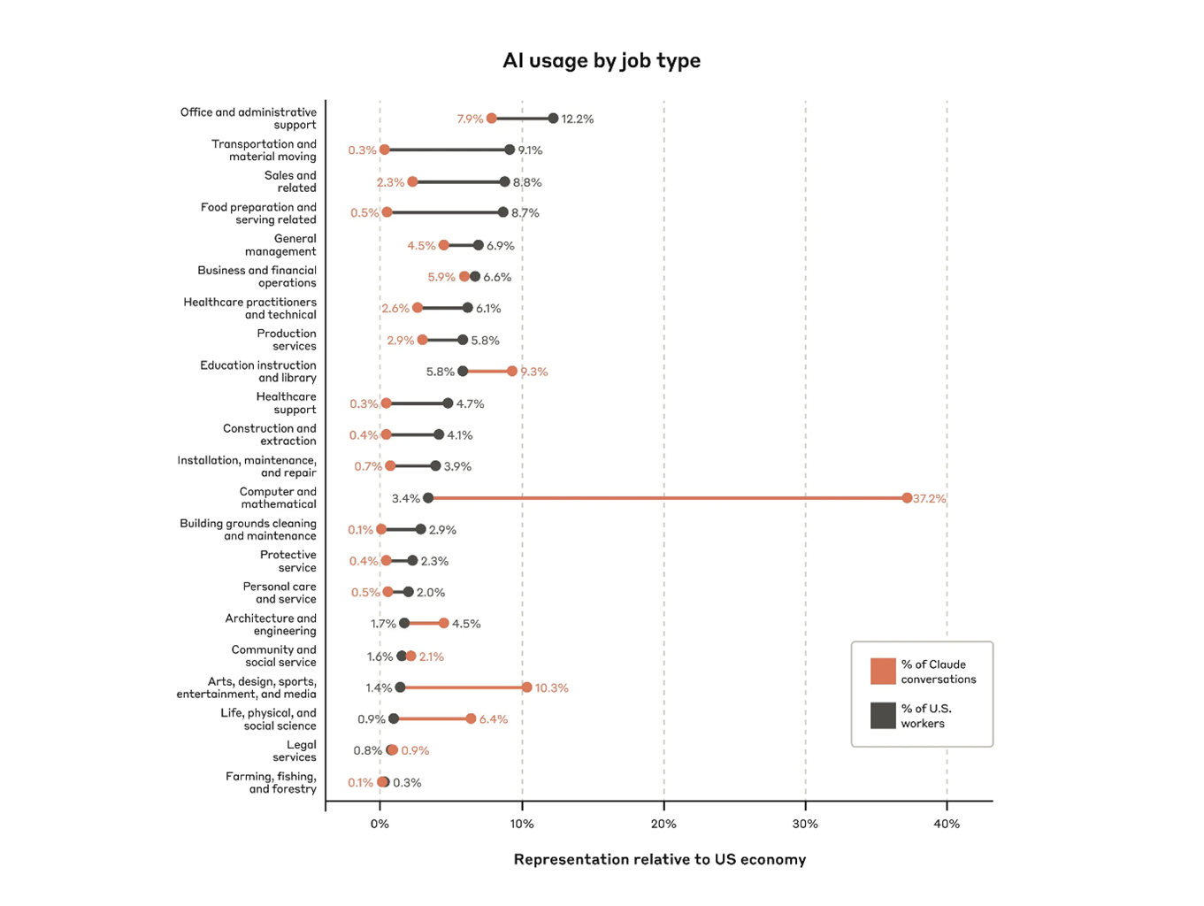 报告发现,尽管AI尚未广泛实现整个工作的自动化,但它已被广泛用于增强特定任务,尤其是在软件开发、技术写作和业务分析领域。AI的使用主要集中在软件开发和写作任务上,这两项任务占总使用量的近一半。按照工作类型划分,采用AI最多的任务和职业是“计算机和数学”类别,其中大部分属于软件工程。第二大类别是“艺术、设计、体育、娱乐和媒体”,主要进行的是各种写作和编辑任务。而在需要体力劳动密集型领域,如医疗保健、交通运输和农业,AI的使用率明显较低,例如只有0.1%的分析对话与农业、渔业和林业任务有关。