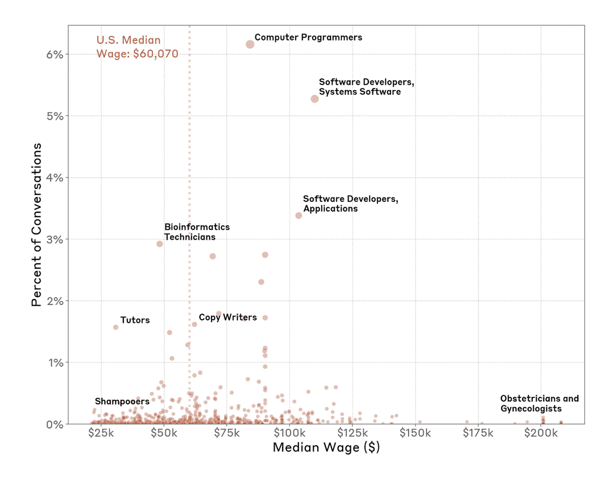 从工资层面分析,高薪酬的工作和低薪酬的工作使用AI的比例都很低,而工资处于中高水平的特定职业是AI使用率最高的职业。这是因为低薪和高薪职业都需要大量的实际动手操作,例如洗发师和妇产科医生在实际工作中都不太会使用AI。这意味着AI在需要分析和技术技能但不一定需要最高水平专业知识的岗位上得到最积极的应用。