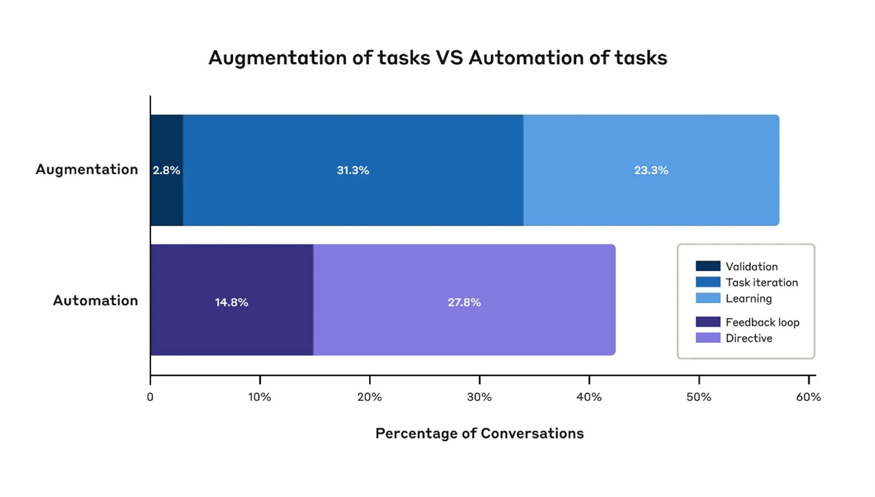 对于人们最关心的AI是否会取代人类,这篇报告也给出了阶段性的答案:至少在目前,超过一半的情况下,AI并没有被用来取代人们完成任务,而是被视为一个好用的助手。报告发现,AI在57%的任务中更倾向于辅助,43%的任务如格式化文档则实现了自动化。很少有职业在大多数相关任务中使用AI,只有大约4%的工作至少在75%的任务中使用了AI。不过,适度使用AI的情况比较普遍:大约36%的工作在至少25%的任务中使用了AI。这种选择性采用表明,尽管AI正在改变工作方式,但尚未导致大范围的工作流失。