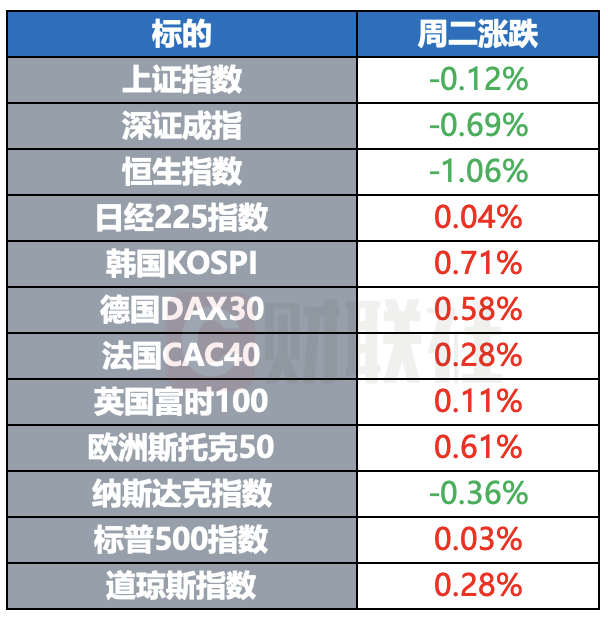 隔夜股市,全球主要指数周二涨跌互现,美股三大指数涨跌不一,道指小幅上涨,标普500指数微涨,纳指小幅下跌。