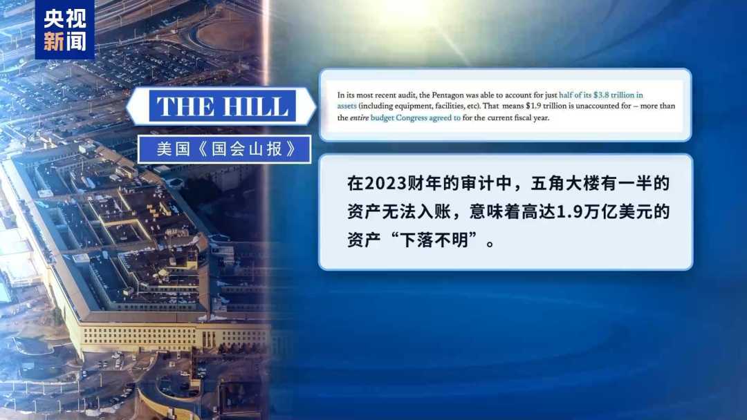 美国《国会山报》曾警告,在2023财年的审计中,五角大楼有一半的资产无法入账,意味着高达1.9万亿美元的资产“下落不明”。