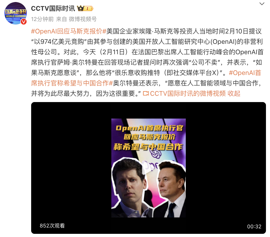 美国企业家埃隆·马斯克等投资人当地时间2月10日提议“以974亿美元竞购”由其参与创建的美国开放人工智能研究中心(OpenAI)的非营利性母公司。对此,OpenAI首席执行官萨姆·奥尔特曼在2月11日的人工智能行动峰会上表示“公司不卖”,并称如果马斯克愿意谈,他将“很乐意收购推特”。同时,奥尔特曼强调,“愿意在人工智能领域与中国合作,并将为此尽最大努力,因为这很重要。”