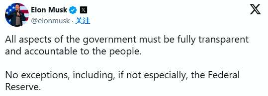 马斯克在X平台上的一篇推文中写道,“政府的所有方面都必须完全透明,并对人民负责。没有例外,包括但不限于美联储”。