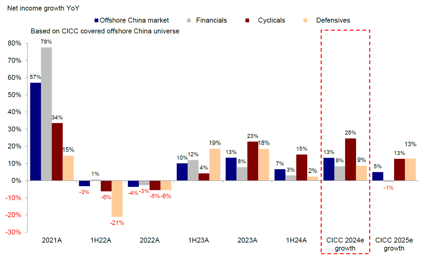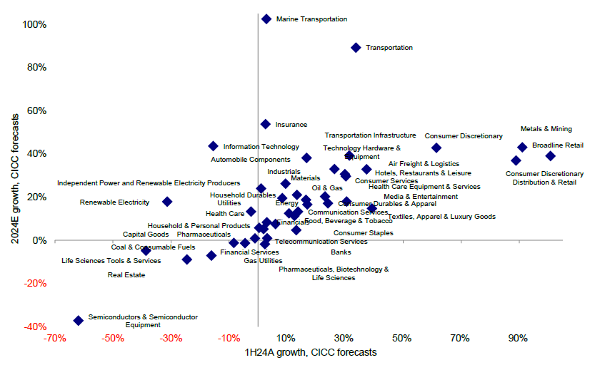 整体来看,2024年海外中资股的盈利预计将增长13.2%,较上半年的同比增速6.6%显著提升。以人民币计价,中金行业分析师对个股的预测显示,2024年港股与中概股公司的盈利增长呈现前低后高的趋势,全年增长13.2%,隐含下半年同比增长近20%。其中,保险、汽车、家电等板块在政策催化下表现尤为亮眼。