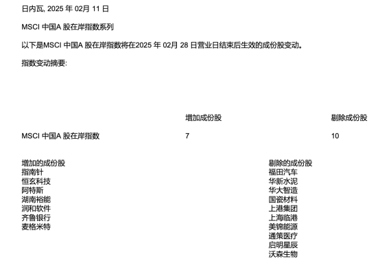 北京时间2月12日凌晨,国际指数编制公司MSCI公布了其2025年2月的指数季度调整结果,本次调整结果将于2月28日收盘后生效。