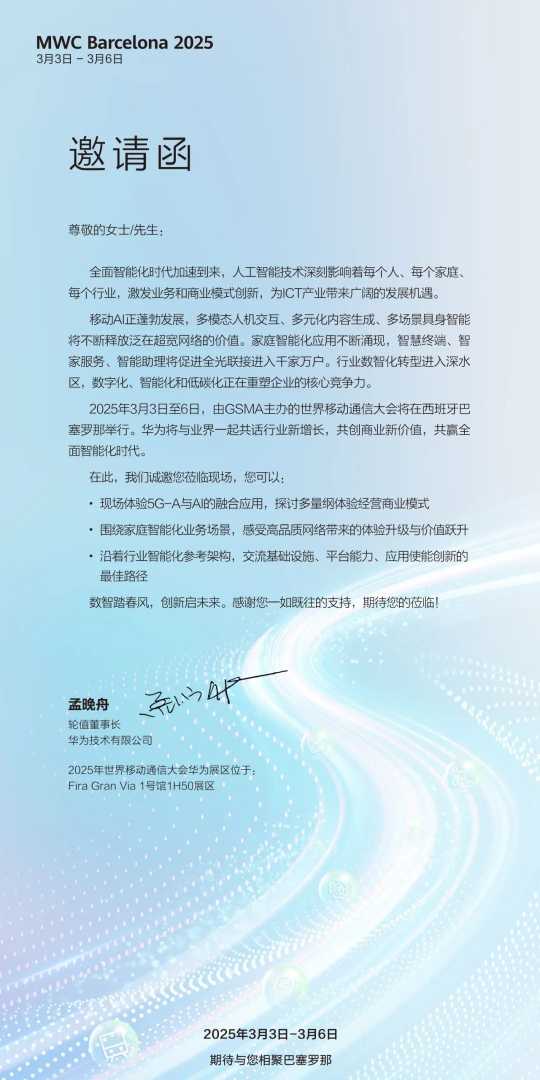 2月11日,孟晚舟发布邀请函,为华为即将亮相2025世界移动通信大会预热。全面智能化时代正加速到来,AI技术深刻影响着个人、家庭及行业,激发业务与商业模式创新。移动AI蓬勃发展,将释放泛在超宽网络价值。展会期间,华为将展示5G-A与AI融合应用及智能化解决方案。