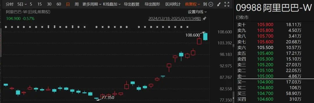 2月11日午间,阿里巴巴创始人马云现身阿里杭州园区,他身穿阿里巴巴黑色文化夹克,向员工挥手致意。2月11日港股开盘后, 阿里巴巴股价表现强劲,盘中一度触及108.6港元/股的阶段高点。年初至今,阿里港股累计上涨近28%。