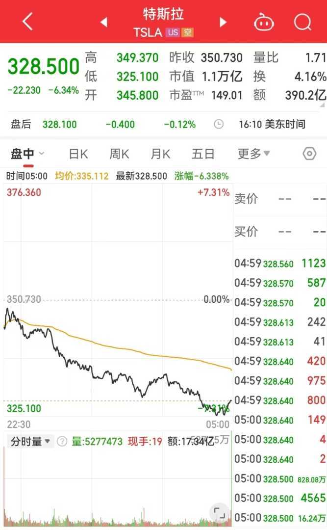特斯拉跌6.34%,报328.5美元,市值一夜蒸发715亿美元(约合人民币5225亿元),创2024年11月以来收盘新低,并创2024年12月18日以来最大单日跌幅。