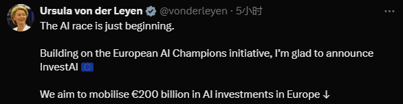 冯德莱恩还强调,“经常有人说欧洲在人工智能竞赛中已经落后,但我不同意这种看法,因为人工智能竞赛远未结束,前沿在不断变化,领导权仍有待争夺。”